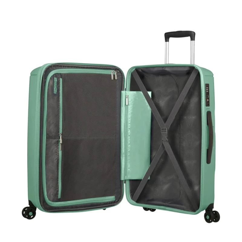Son intérieur renferme deux compartiments entièrement doublés avec scindé par un plateau séparateur souple et zippé équipé de deux grandes poches zippées en filet. . Les deux espaces sont équipés de sangles élastiques croisées permettant de maintenir efficacement les habits durant les voyages. En complément de rangement, l’autre espace d’accueil est doté d’une poche large et zippée, très pratique pour isoler des accessoires.