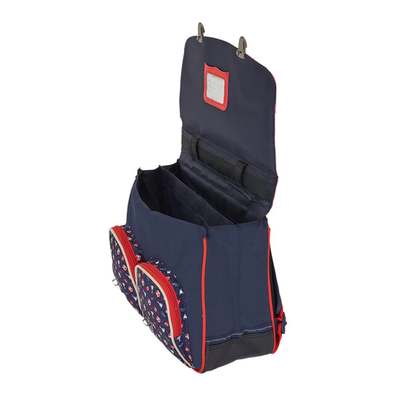 Sous le rabat, on trouve une ribambelle de commodités : Poche zippée, poche spéciale règle et poche planning plastifiée. Le cartable dispose de deux grands compartiments, cela permettra d’accueillir de manière organisée les cahiers 24 x 32 cm, les classeurs et le reste du matériel scolaire. Il offre également toute la place nécessaire pour mettre à l’abri le goûter de votre enfant.