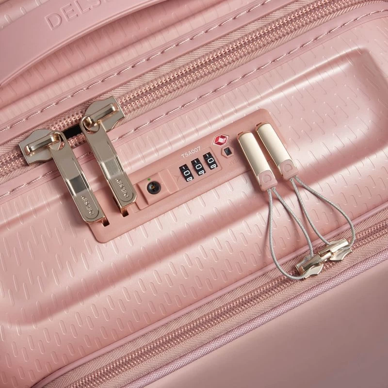 Cette valise rigide Delsey Turenne dispose de 4 doubles roues multidirectionnelles Ă 360° et silencieuses, et d’un trolley ajustable double tube pour faciliter vos dĂ©placements et les rendre beaucoup plus agrĂ©ables. On trouve aussi deux poignĂ©es de portage : l’une sur le dessus de la valise et la deuxième sur le cĂ´tĂ© latĂ©ral, très pratiques si vous avez le besoin de la transporter Ă la main.