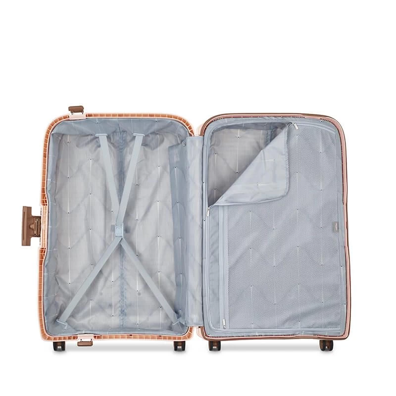 A l’extérieur, cette valise rigide Delsey Moncey 82 cm ,dispose de renforts de protection, d’un porte-adresse , au format du logo Delsey, ainsi que d’accessoires de transport parfaitement intégrés à son design.