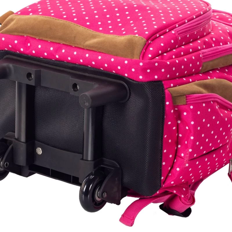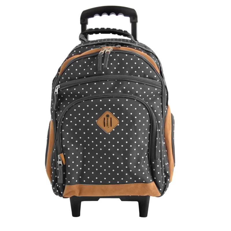 Le sac à dos 2 roues Snowball à Pois blancs met à disposition un grand compartiment doublé avec fermeture à glissière. Il peut accueillir des grands formats de cahiers comme 24×32, des documents A4, classeurs en tout genre et agenda y trouvent une place aisément. Sur la partie frontale, deux poches à zip proposent différentes solutions de rangements pour ranger et sérier les fournitures scolaires. 3 autres poches zippées en complément sont présentes pour avoir des objets et accessoires facilement et rapidement accessibles.