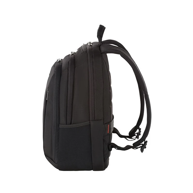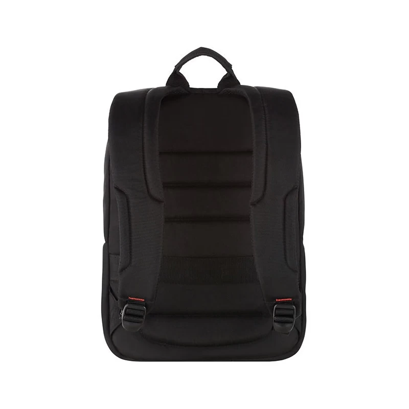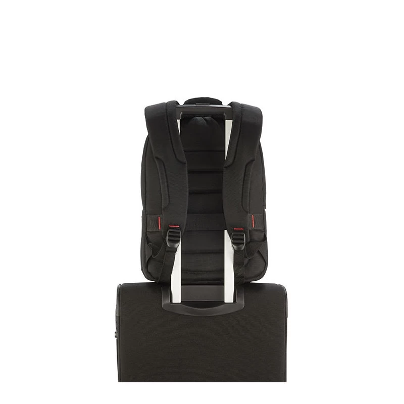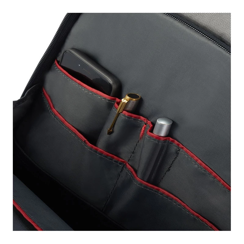 Sa poignée supérieure est douce au toucher pour un confort de voyage accru. Le sac possède un compartiment ordinateur 14 pouces avec une fermeture à glissière pouvant être sécurisée et portant le logo Samsonite. Une grande poche zippée verticale est présente à l’avant, ainsi que deux poches élastiques latérales en filet pour porter des bouteilles. Aussi, une poche avec des rangements astucieux permettant de garder des stylos et autres petites affaires.