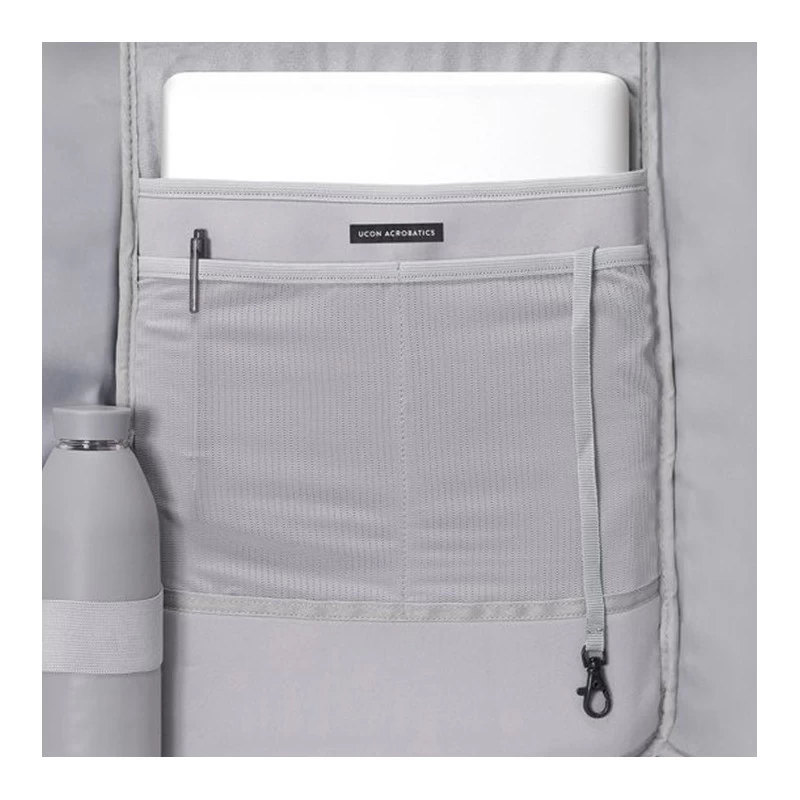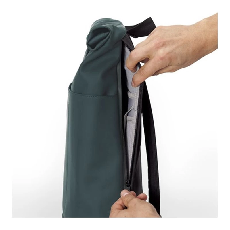 A l’intérieur, il comporte un grand compartiment accessible soit par le haut grâce à un système de rouleau fermé par une sangle velcro soit par une fermeture à glissière dissimulée sur l’un des côtés du sac. Ce compartiment se compose de nombreux espaces de rangement afin d’organiser au mieux vos effets personnels: un emplacement en néoprène pouvant accueillir un ordinateur jusqu’à 15,4 pouces avec 2 poches en filet où vous pourrez glisser votre smartphone, porte-monnaie…; un porte bouteille élastique ou encore une attache pour porte-clés.