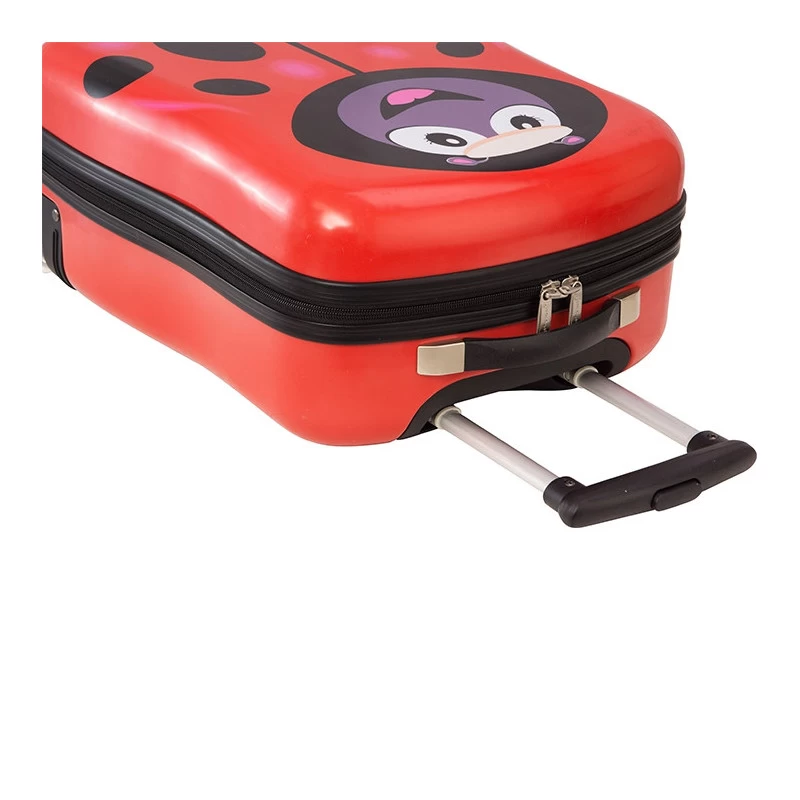 La valise enfant Coccinelle se tracte sans effort grâce à son trolley double tube et ses 2 roulettes. Pour la soulever à la main, il est possible d’utiliser sa poignée haute renforcée. Pour accéder à son contenu facilement, elle est dotée d’une fermeture à glissière. Son petit pied stabilisateur lui confère une bonne stabilité en position verticale même quand elle est chargée.