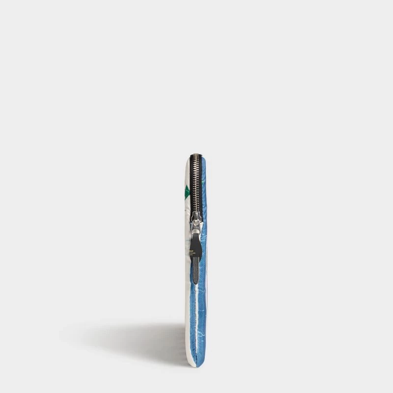 Elle se compose d’un compartiment hydrofuge et accessible par une fermeture à glissière YKK, dont la bande est recyclée et la tirette est en cuir recyclé. Celui-ci peut accueillir un ordinateur jusqu’à 13″ et 14″ (MacBook Pro 14 pouces depuis 2021, MacBook Air 13 pouces depuis 2017 et Macbook Pro 13 pouces depuis 2016). Ce dernier sera idéalement protégé par des rembourrages en mousses biosourcées et recyclables de 5 mm situés de part et d’autre de la pochette. Il y a également la présence de deux sangles élastiques pour un ajustement et maintien serré de l’équipement.